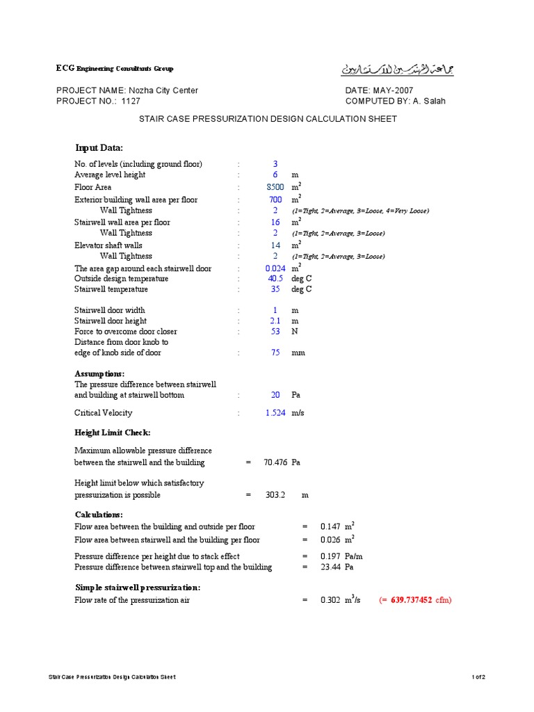 Staircase pressurization calculation pdf. Stairwell Pressurization Fan Calculation Excel Sheets. Download Staircase Pressurization Calculationspdf. In addition the lower two floors will be considered opened while the others doors will be considered closed.