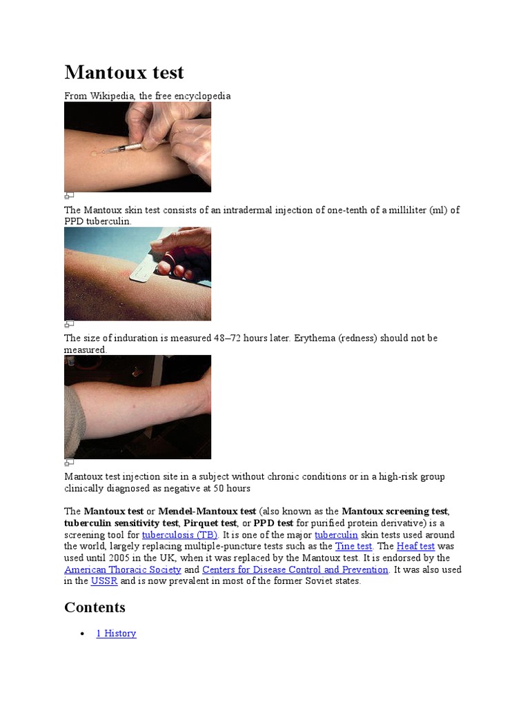 Der Test dient dazu eine durchgemachte Tuberkulose-Erstinfektion oder eine Tuberkulose-Impfung zu beweisen. Look through examples of Mendel-Mantoux-Test translation in sentences listen to pronunciation and learn grammar. For the test 01ml 5 units of purified tuberculin are injected intradermally at the inner side of the forearm.
