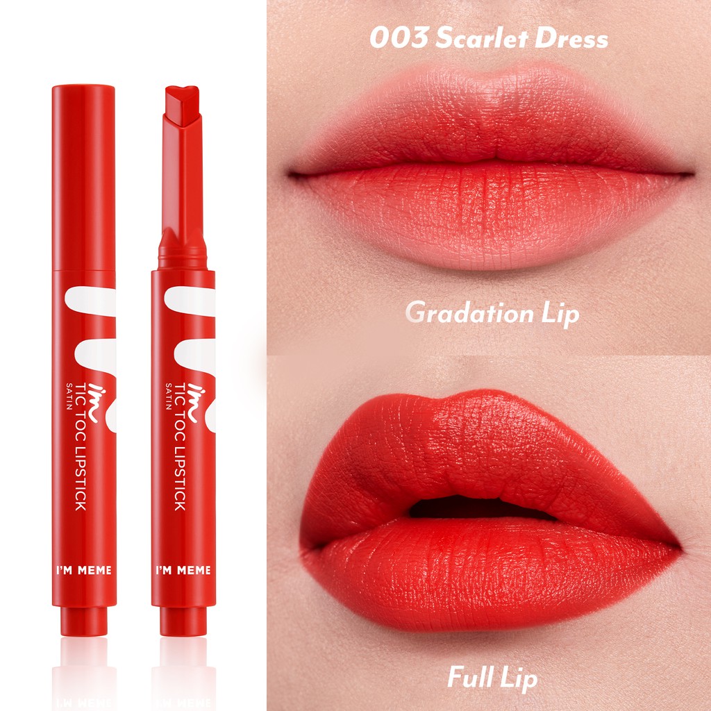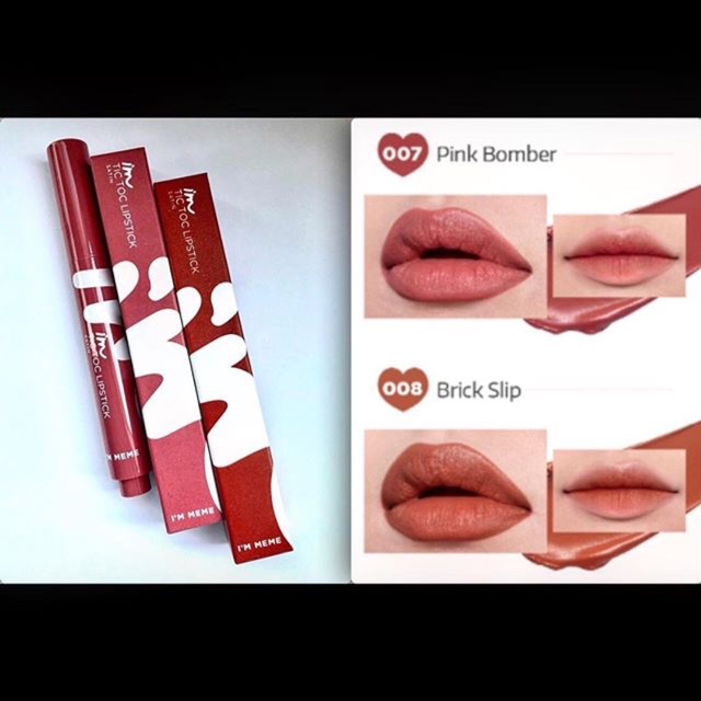 See It Styled On Instagram. MEMEBOX IM MEME IM Tic Toc Tint Lip Cashmere delivers a juicy wash of color with a soft cushion tip applicator in 10 shades. 1 x Memebox IM MEME Im Tic Toc Lipstick SatinCute heart-shaped tube makes it easy to apply this lipstick evenly over lips.