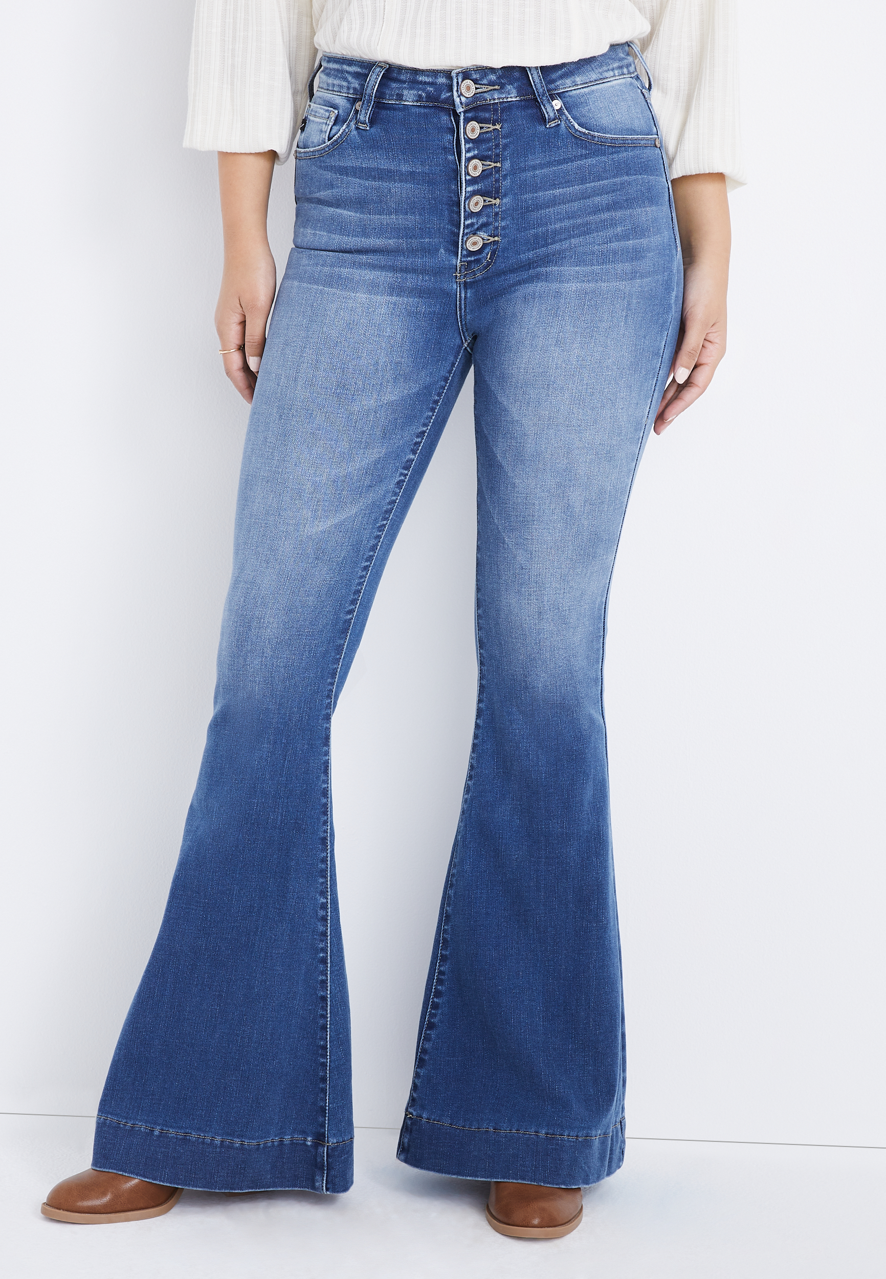 Kancan Womens Petite High Rise Button Fly Flare Jeans - KC7348. Womens Flare Bell Bottom Jeans High Rise Button Fly Flare Jeans Denim Pants. These dark wash jeans feature a button front fly kick flare and five pocket design with belt loops.