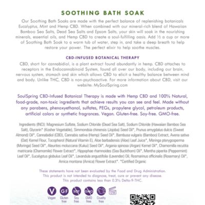 Soothing CBD Bath SoakReplenish Rescue EmpowerEucalyptus Lavender Rosemary MintOur Soothing Bath Soaks are made with the perfect balance of relieving botanicals Eucalyptus Mint and Hemp CBD. Soul Spring Cbd Bath Soak. When combined with our mineral-rich blend of Hawaiian Bamboo Sea Salts Dead Sea Salts and Epsom Salts your skin wi.